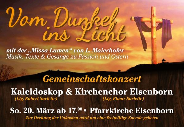 Es steht unter dem Leitgedanken "Vom Dunkel ins Licht" mit der Missa Lumen von L. Maierhofer mit Musik, Texten und Gesängen vom Leidensweg Jesu bis zur Auferstehung.