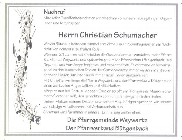 Am Donnerstag, 11. August 2016, haben der Pfarrverband Bütgenbach und die Kirchenchöre Bütgenbach und Berg, der Männergesangverein Honsfeld, seine Kollegen und Mitarbeiter, sowie viele Freunde zusammen mit der Familie Abschied genommen von unserem langjährigen Organisten und Chorleiter, Herrn Christian Schumacher.