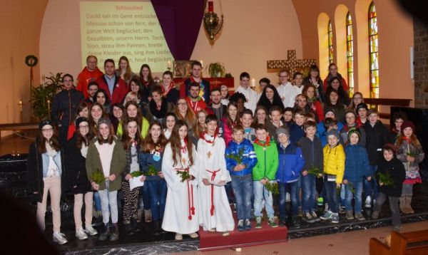 Nach der Segnung der Zweige, die im Freien auf dem Schulhof in Weywertz oder am Eingang der Pfarrkirche in  Bütgenbach und Elsenborn stattfindet, beginnt die Prozession - auch die kann für Euch ein besonderes Erlebnis sein. Traditionell singen wir zur Prozession „Hosanna dem Sohne Davids. Hochgelobt sei, der da kommt im Namen des Herrn". Was liegt also näher, als Euch Kinder in den Prozessionsgesang am Palmsonntag auf besondere Weise einzubeziehen?