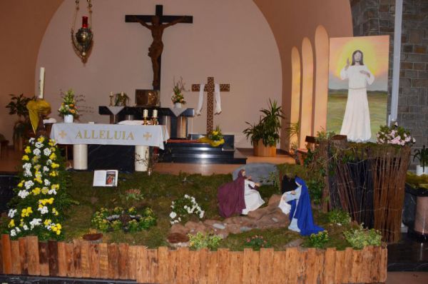 In vielen Bildsymbolen findet sich die Auferstehungsfreude wieder. Eine große knorrige Wurzel wird über und über mit Blumen geschmückt. Neben der Osterkerze und dem Baum der Täuflinge ist die sprudelnde Quelle ein wichtiger Bestandteil des Ostergartens, wie auch das große Buch, das in großen Lettern von der Auferstehung kündet und das Weizenkorn, das aus der Erde hervordringt und sich der Ostersonne entgegenstreckt. Das Füllhorn zeugt von dem übersprudelnden Leben, das aus der Auferstehung dem Glaubenden entgegenkommt. Anschaulich für die Kirchenbesucher in Szene gesetzte Figuren wie die von Maria Magdalena komplettieren das Ensemble. „Die Blumen sind Symbole des Lebens und der Lebensfreude, die Gott den Menschen mit der Osterbotschaft verkündet“, erläutert Roswitha Boemer, die für die Blumendekoration zuständig ist.