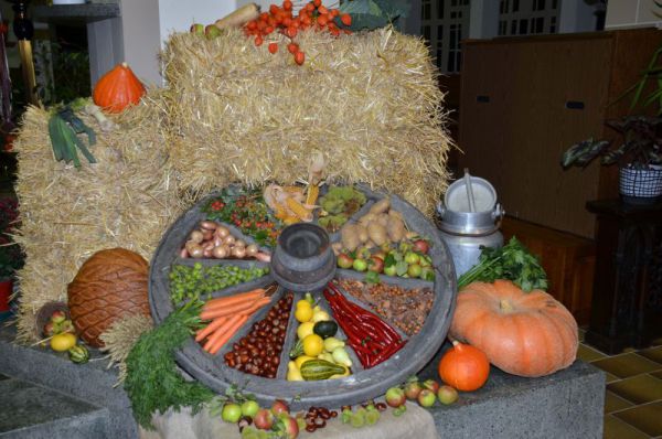 Liebe Pfarrfamilie, Kürbisse, Brote, Kohlköpfe, Äpfel, Weintrauben und Sonnenblumen - prächtige Arrangements von Obst und Gemüse schmücken an diesem Erntedankwochenende wieder unsere Kirchen. Dafür sei den Landfrauen herzlich gedankt.Das typisch herbstliche Erntedankfest scheint in unserer Überflussgesellschaft, in der es alles auch zu jeder Jahreszeit zu kaufen gibt, überflüssig zu sein. Angesichts zunehmend manipulierter Lebens-mittel, Mikrowellenmenüs und Fastfoodkultur wirkt ein Erntedankfest für viele geradezu paradox, erscheinen die mit Früchten und anderen Lebensmitteln geschmückten Altäre wie ein Relikt aus längst überholter Zeit, ein allenfalls folkloristisches Brauchtum.