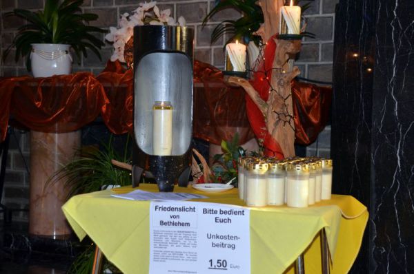 Bereits zum 24. Mal kommt das Friedenslicht aus Bethlehem von Wien nach Eupen, wo es an kommenden So., 15. Dez., um 17.30 Uhr in der Eupener Friedenskirche verteilt wird. Auch unser Pfarrverband ist wieder mit fünf Personen vertreten. Am Montag, 16. Dezember, nehmen wir es im Gottesdienst in Empfang. Das Licht aus der Geburtsgrotte in Bethlehem könnt Ihr ab Weihnachten in unseren Pfarrkirchen entzünden, wo es die weihnachtliche Botschaft verkünden soll. Dazu erhaltet Ihr Dreitagelichter (1,50 €).