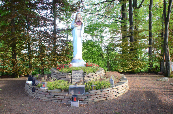 Im Sockel der Marienstatue wurde eine Urkunde eingemauert, die in lateinischer und deutscher Sprache von dem Ereignis Kunde gibt: „Im Jahre des Heils 1956, zum Feste Mariä Himmelfahrt, unter dem Pontifikate seiner Heiligkeit Papst Pius XII., unter der Regierung seiner Majestät des Königs Balduin I. von Belgien, in den Tagen, wo seine Exzellenz Ludwig Josef Kerkhofs die Diözese Lüttich leitete, zur Amtszeit des hochwürdigen Herrn Ludwig Lejoly für die Pfarre und des Herrn Bürgermeisters Paul Weynand für die Gemeinde, wurde diese Statue, von des Künstlers Hand Pater Geraldo Roderfeld aus dem Kloster Garnstock (bei Eupen) der Franziskaner gemeißelt, feierlich eingeweiht unter dem Titel „Maria im Felde".
