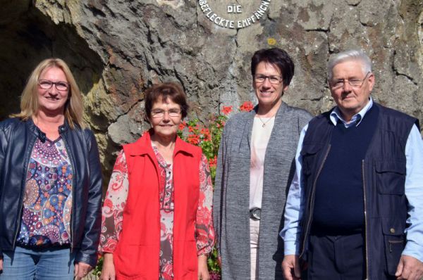 Gruppenfoto mit einigen Verantwortlichen der Marienfeier "Im Dienste der Königin" in Rocherath-Krinkelt: vlnr.: Laura Piront, Gilda Pfeiffer (Förderinnen), Anita Mertens (Kontaktgruppe der Pfarre), Pastor Ludwig Hilger.