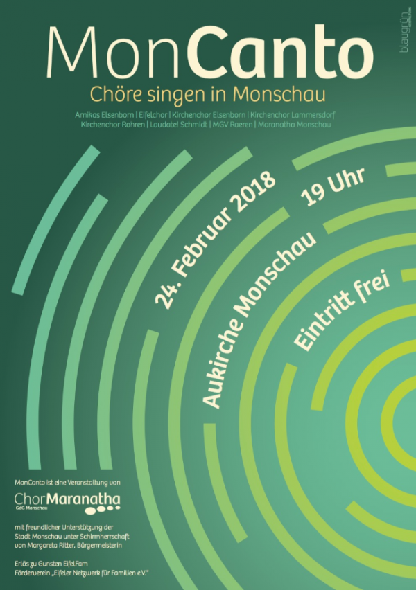 Der Konzertabend "Mon Canto" ist in Monschau neu. Er wurde von Maranatha ins Leben gerufen Inspiriert durch die Mitwirkung des Chores am Abend der Städteregion im Krönungssaal Aachen haben sich die Sänger gefragt: Geht so etwas auch in Monschau, und nach einigen Gesprächen wurde folgende Idee entwickelt: Maranatha möchte einen Chorabend in Monschau organisieren, an dem mehrere Chöre unterschiedlicher Natur und mit sehr unterschiedlichem Repertoire jeweils einen Auftritt von ca. zehn bis zwölf Minuten haben.