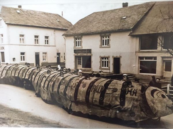 Neben dem Motivwagen gibt es die Fußgruppe aus 48 Personen, meistens junge Familien mit Kindern aus dem Ort. "Wir sind eine eher lose Gruppe, die sich nur in der Karnevalszeit zusammenfindet", erläutert der 37-jährige Pascal Niessen, der die Idee schon länger hegte, einen Wagen zu bauen, dessen Motiv vor 58 Jahren, im Jahr 1960, damals von diesen Männern aus Bütgenbach, erdacht worden ist: Willy Berger, Ludwig Wey, Herbert Reinertz, Erich Niessen, Richard Schumacher, Heinz Kaulmann, Alfred Wey, Rudolf Brüls, Nikla Brüls, Erwin Schumacher, Robert Wey, Ernst Veithen, Hermann-Josef Schmitz, Franz-Josef Schleck, Ernst Wey, Josef Brandenburg und Hermann Andres, hießen die damaligen Wagenbauer. Diese heute älteren Herren, einige sind bereits verstorben, saßen damals auf 16 Fahrrädern, die miteinander verbunden waren, um die Raupe zu bilden. Damals wurde der Wagen im Keller und im Saal Niessen in der Bütgenbacher Seestraße gebaut und zusammengefügt. "Auf einem VHS-Videofilm von Ernst Veithen habe ich dieses phantastische Motiv einer sich schlängelnden Raupe gesehen." Pascal Niessen war von dieser sagenhaften Idee so fasziniert, dass er nicht mehr davon losließ und in Torsten Ritter und David Murges zwei Mitstreiter fand. Sonja Ritter-Niessen hat mit Hilfe von Verena Münster und Stephanie Richter den Wagen wie eine Raupe liebevoll dekoriert und bemalt. Mehrfache Anstriche sorgten für die authentischen Raupenfarben., dafür wurden viele Tuben Farbe auf den Drainagetüchern verbraucht.